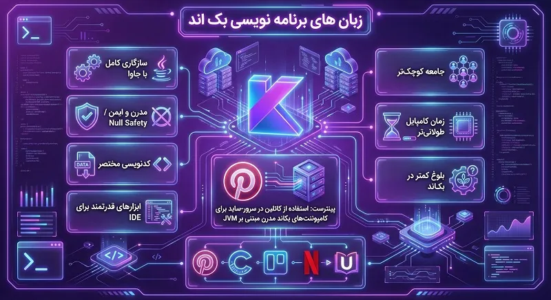 کاتلین، به عنوان یک جایگزین مدرن و مختصرتر برای جاوا، با حفظ سازگاری کامل با JVM، به سرعت در حال گسترش است. ویژگی هایی نظیر Null Safety و گرامر مختصر، آن را برای توسعه سمت سرور جذاب می سازد.