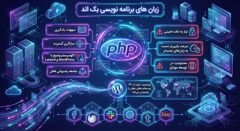 o اکوسیستم وسیع: بهره مندی از فریم ورک های قدرتمند (مانند Laravel) و سیستم های مدیریت محتوا (مانند WordPress).