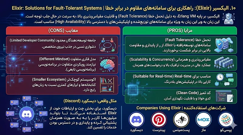 الیکسیر، بر پایه Erlang VM، به دلیل تحمل خطا (Fault Tolerance) و قابلیت مقیاس پذیری بالا، به سرعت در حال جلب توجه است. این زبان به ویژه برای سامانه های توزیع شده و اپلیکیشن های با دسترسی بالا (High Availability) مناسب است.