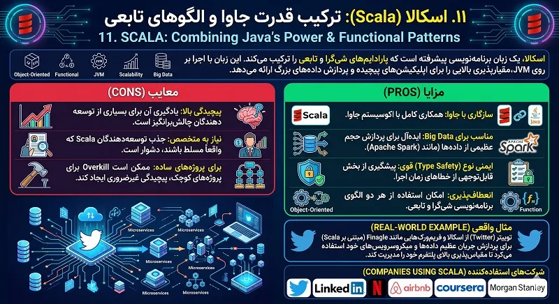 اسکالا، یک زبان برنامه نویسی پیشرفته است که پارادایم های شی گرا و تابعی را ترکیب می کند. این زبان با اجرا بر روی JVM، مقیاس پذیری بالایی را برای اپلیکیشن های پیچیده و پردازش داده های بزرگ ارائه می دهد.