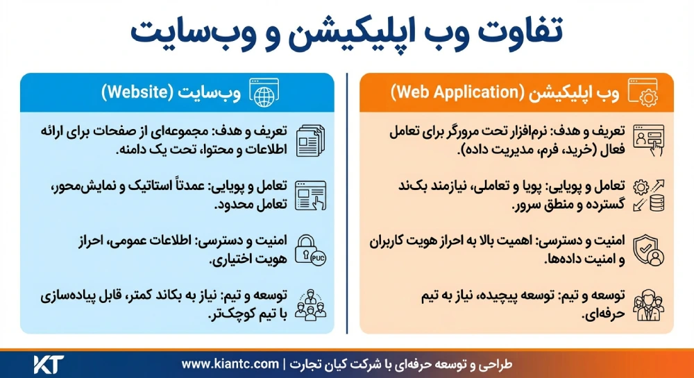 وبسایت مجموعهای از صفحات وب است که تحت یک نام دامنه مشترک قرار دارند و از هر نقطه جهان قابل دسترسی هستند و عمدتاً برای ارائه اطلاعات و محتوا طراحی شدهاند. در مقابل، وباپلیکیشن نوعی نرمافزار است که از طریق مرورگر قابل استفاده است و امکان تعامل فعال کاربران با سیستم را فراهم میکند، مانند خرید آنلاین، ارسال فرم یا مدیریت دادهها.